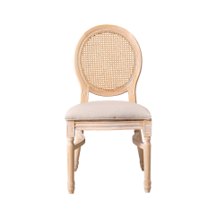 Fabriquée en bois massif, la chaise offre la stabilité et la durabilité nécessaires à une utilisation intensive dans les espaces commerciaux. Le dossier en rotin vient subtilement rompre la forme classique, lui apportant légèreté et raffinement. L’assise rembourrée garantit un confort optimal, même pendant les longues cérémonies et réceptions.