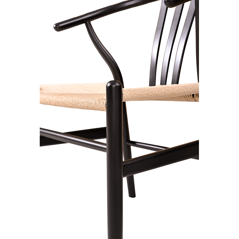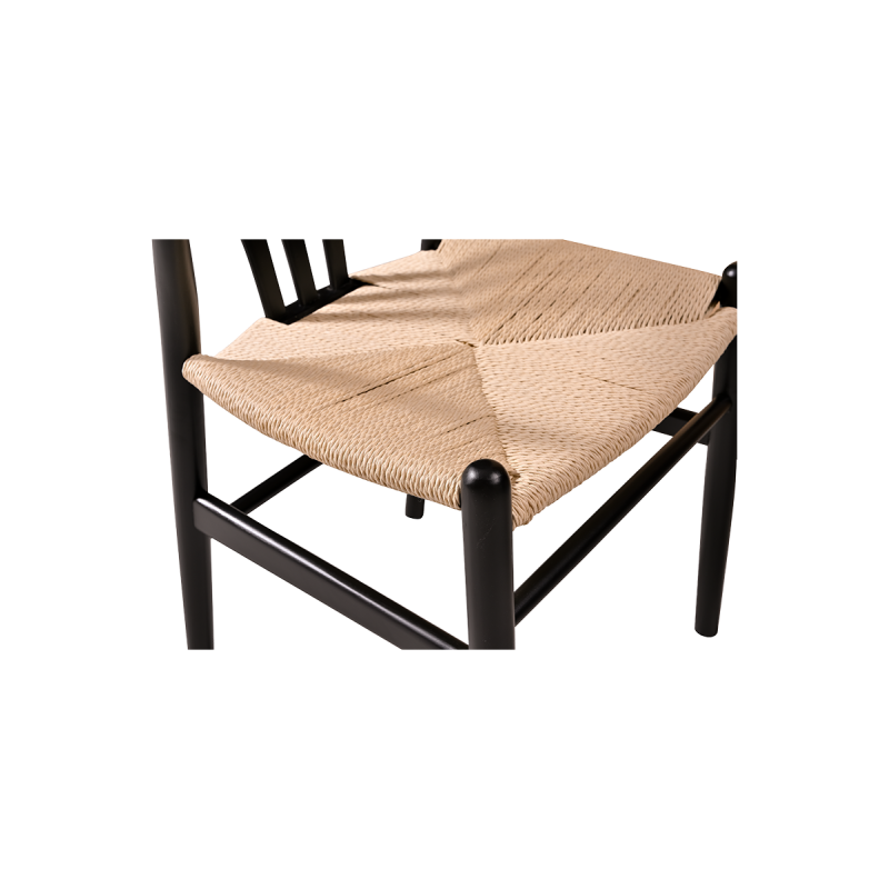 L’assise en corde tressée selon un motif géométrique apporte à la chaise légèreté et originalité, tout en offrant confort et résistance. La teinte naturelle de la corde contraste magnifiquement avec la structure foncée de la chaise, créant une composition harmonieuse qui marie artisanat traditionnel et design contemporain.