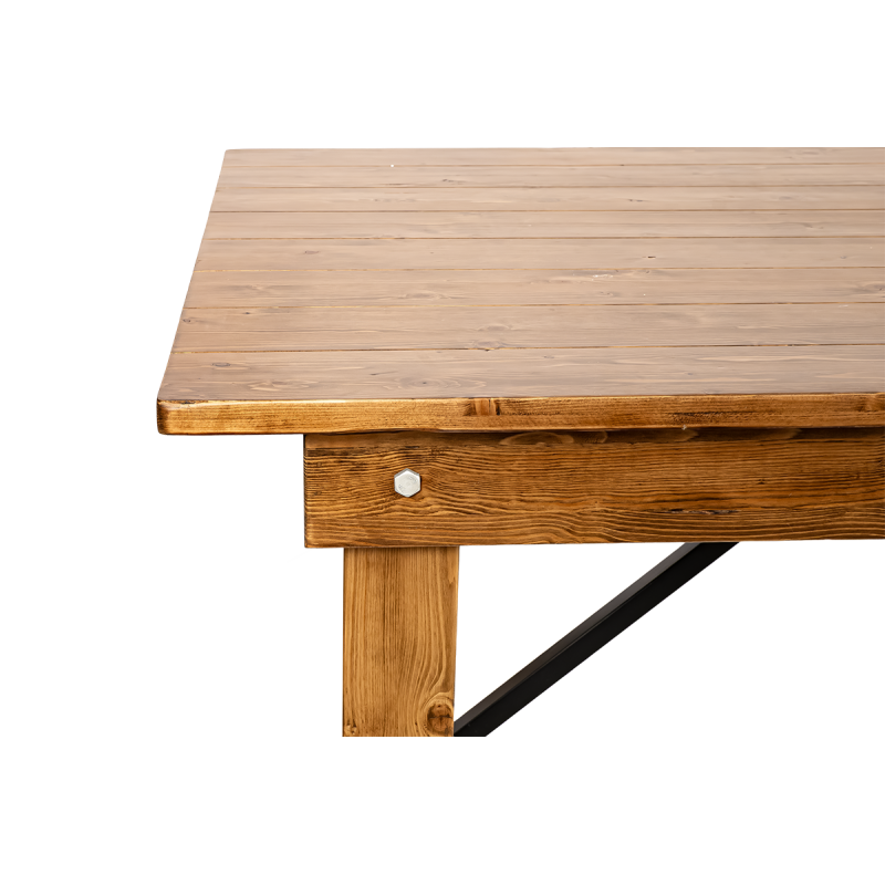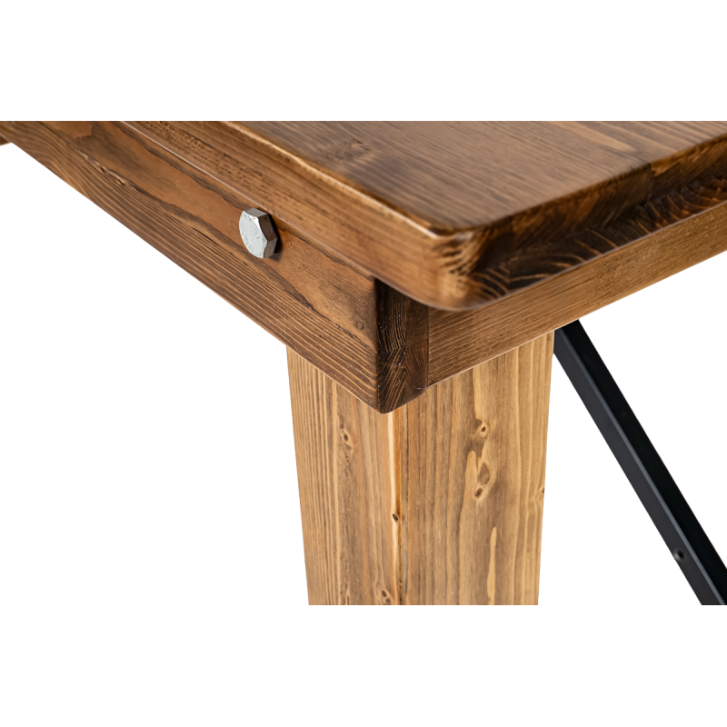 La structure naturelle du pin met en valeur le charme unique de la table, apportant chaleur et convivialité à l’intérieur. Les détails soigneusement travaillés et le veinage visible du bois lui confèrent un aspect authentique et champêtre. Les renforts métalliques augmentent la stabilité de la construction, garantissant une utilisation sûre même lors de grands événements.
