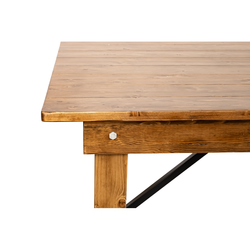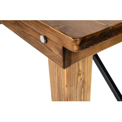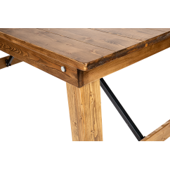 La structure naturelle du pin met en valeur le charme unique de la table, apportant chaleur et convivialité à l’intérieur. Les détails soigneusement travaillés et le veinage visible du bois lui confèrent un aspect authentique et champêtre. Les renforts métalliques augmentent la stabilité de la construction, garantissant une utilisation sûre même lors de grands événements.