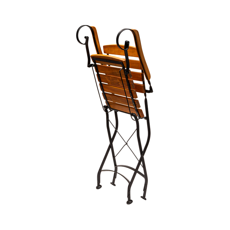 Le cadre est en acier peint par poudrage avec une finition noire brillante. Le profil de 6 mm d’épaisseur assure stabilité et robustesse. L’assise et le dossier sont constitués de lattes en bois d’acacia de 19 mm d’épaisseur et 55 mm de largeur – un matériau à la fois esthétique et résistant aux conditions climatiques et à un usage intensif. La chaise est pliante, ce qui facilite son rangement, son transport et la préparation rapide de l’espace d’accueil.
